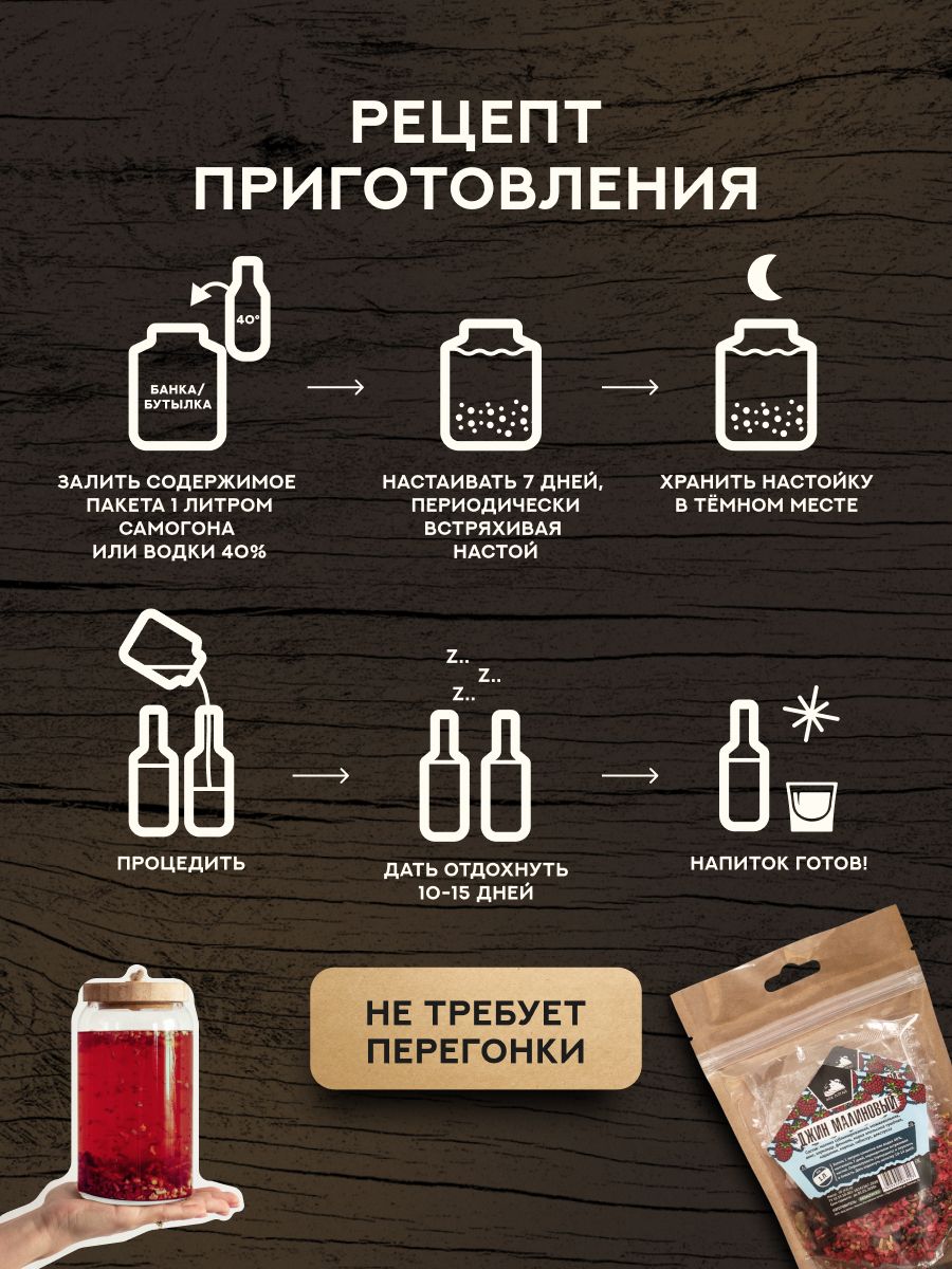 залить 1 литром самогона или водки 40%, настаивать 7 дней, переиодически встряхивая настой. Отфильтровать (процедить) и перелить в емкость. Дать отдохнуть напитку 10-14 дней.