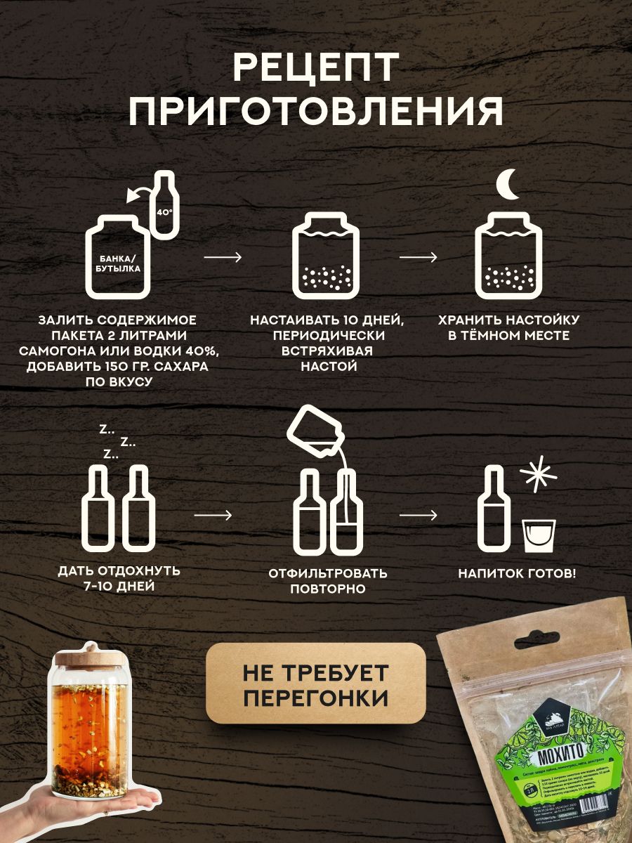 Залить 2 литра самогога или водки, добавить 150 грамм сахара (по вкусу), настаивать 10 дней. Переиодически встряхивая настой. Отфильтровать и процедить в емкость. Дать напитку отдохнуть 10-14 дней.