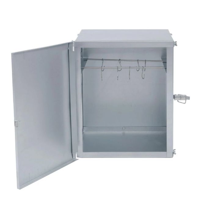 У камера полностью разборная конструкция. Она не занимает много места при хранении и транспортировке. С одной стороны, камера для копчения мобильна и компактна, а с другой, вмещает до 20 кг мяса. В собранном состоянии ее объем — 50 л. Продукты можно подвешивать на крючках, которые уже включены в стандартную комплектацию.
